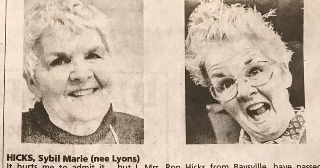 “It hurts me to admit it… but I, Mrs. Ron Hicks from Baysville, have passed away. I passed peacefully with my eldest daughter, Brenda, by my side February 2, 2019 at 8:20 a.m.” it starts.
