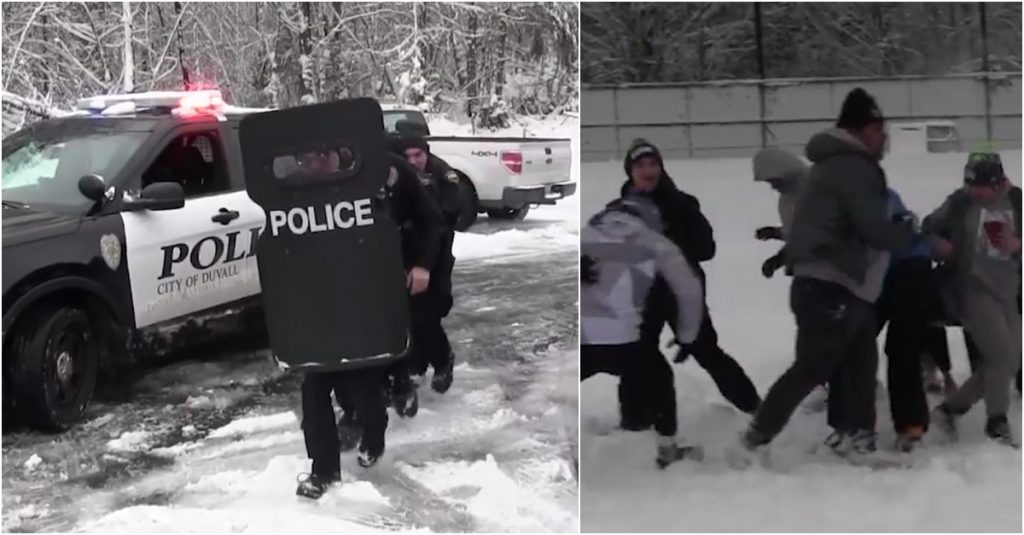 This is certainly not a sight that you see every day! Police cars approached children in the Duvall, Washington area with their lights flashing as they gathered in a local park for a friendly snow football game and were NOT fully prepared for what was about to happen. As the cops slowly exit their vehicles in the video, it’s clear that they’re hiding behind huge riot shields. Why, though? Why do these cops storm the snow-covered fields of Duvall, Washington, when these innocent children just want to mind their own business play and the great American football sport of football?