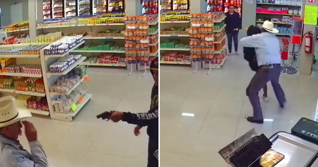 As the two fling themselves around the store, the robber drops his gun. That’s when a skittish butcher sprints into the frame and snaps up the firearm.