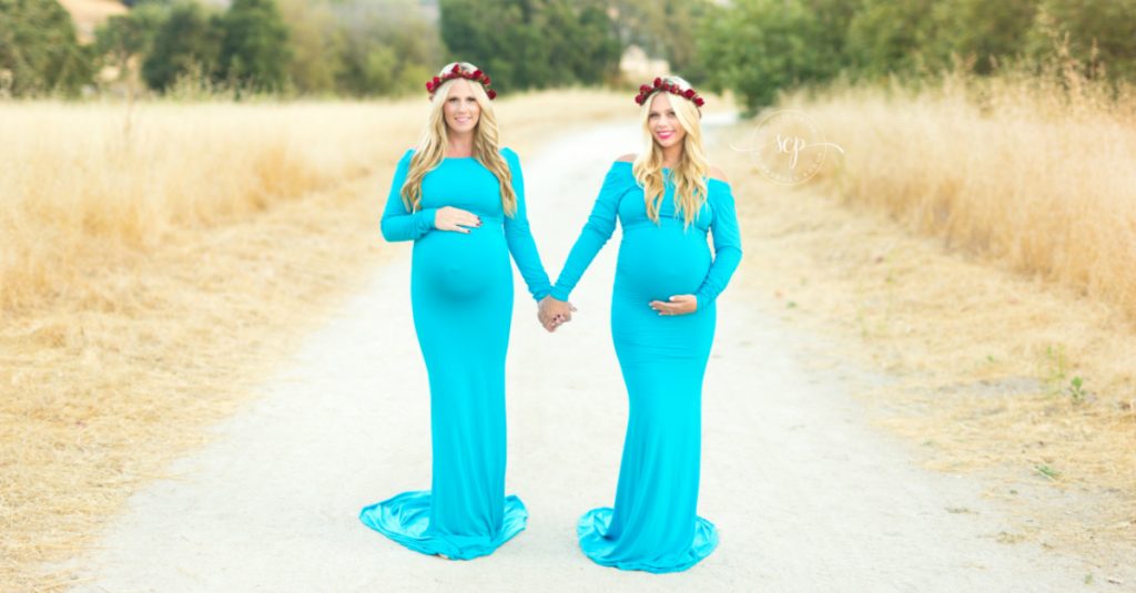 Pregnant Sisters Pose In Blue Dresses, Then Recreate Photo 1 Year Later With ‘Twin Cousins’