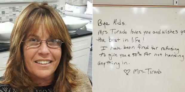 While packing up her things after school hours, Ms Tirado scribbled a message to her former students on a whiteboard before leaving: “Bye Kids, Mrs. Tirado loves you and wishes you the best in life! I have been fired for refusing to give you a 50% for not handing anything in. ? Mrs. Tirado”