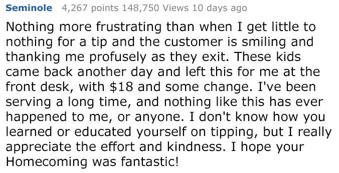 The waiter found the letter the teens wrote along with a little over $18 at the front desk of the restaurant. They dropped off this letter a week after their homecoming dinner. It read, “You were kind, helpful, accommodating, didn’t treat us like babies, and were even able to fit the food to all my allergies! So I wanted to say thank you for making our “grown-up” experience so amazing and fun.” The letter wasn’t just another thank you note. The teens also wanted to say sorry for their initial tip. The teen who wrote the note admitted that they weren’t sure how much to give as a tip so they dug in their pockets for change and all they could come up with was $3.28. Someone must have surely informed the teenagers about proper tipping after the homecoming dance. The letter went on to explain that, “Not aware of how small this (tip) really was, we left, clueless of what we had left you for all your hard work. Later we realized our mistake and felt HORRIBLE. We knew we had to make it right. So in this envelope, you will find the correct 18% tip + extra for simply being amazing.”