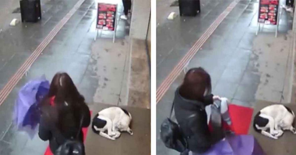The woman couldn’t pass the dog by without helping as you can see in the video when she puts a blanket over him.